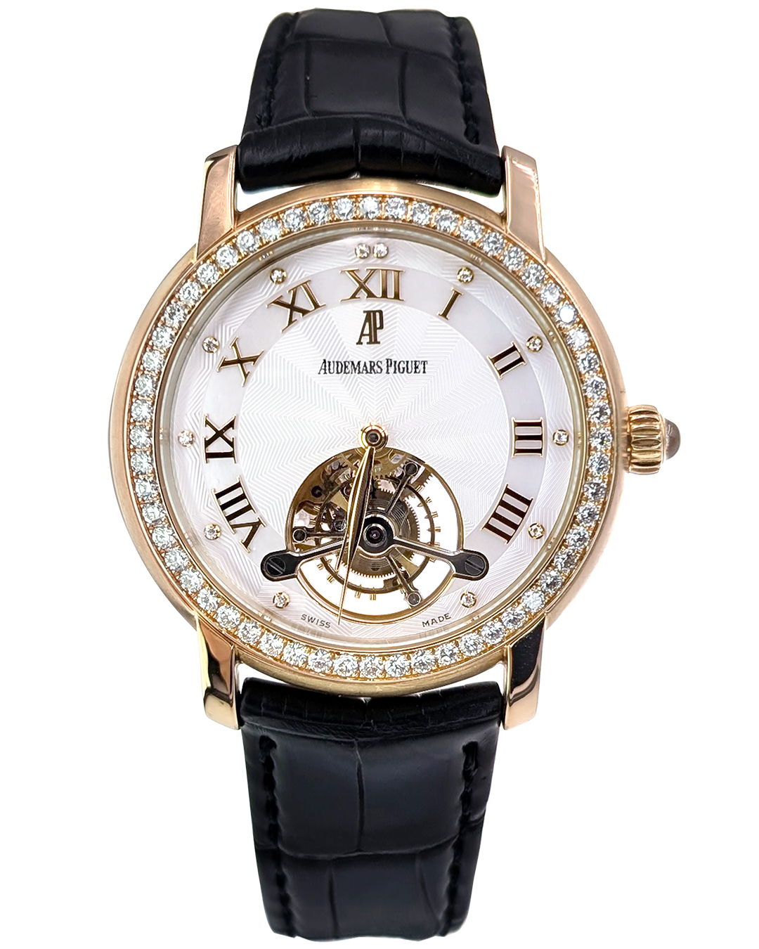 Audemars Piguet Jules Audemars Tourbillon 39mm 18K RG Diamonds Bezel Silver Roman Dial Leather Strap Hand Winding Watch