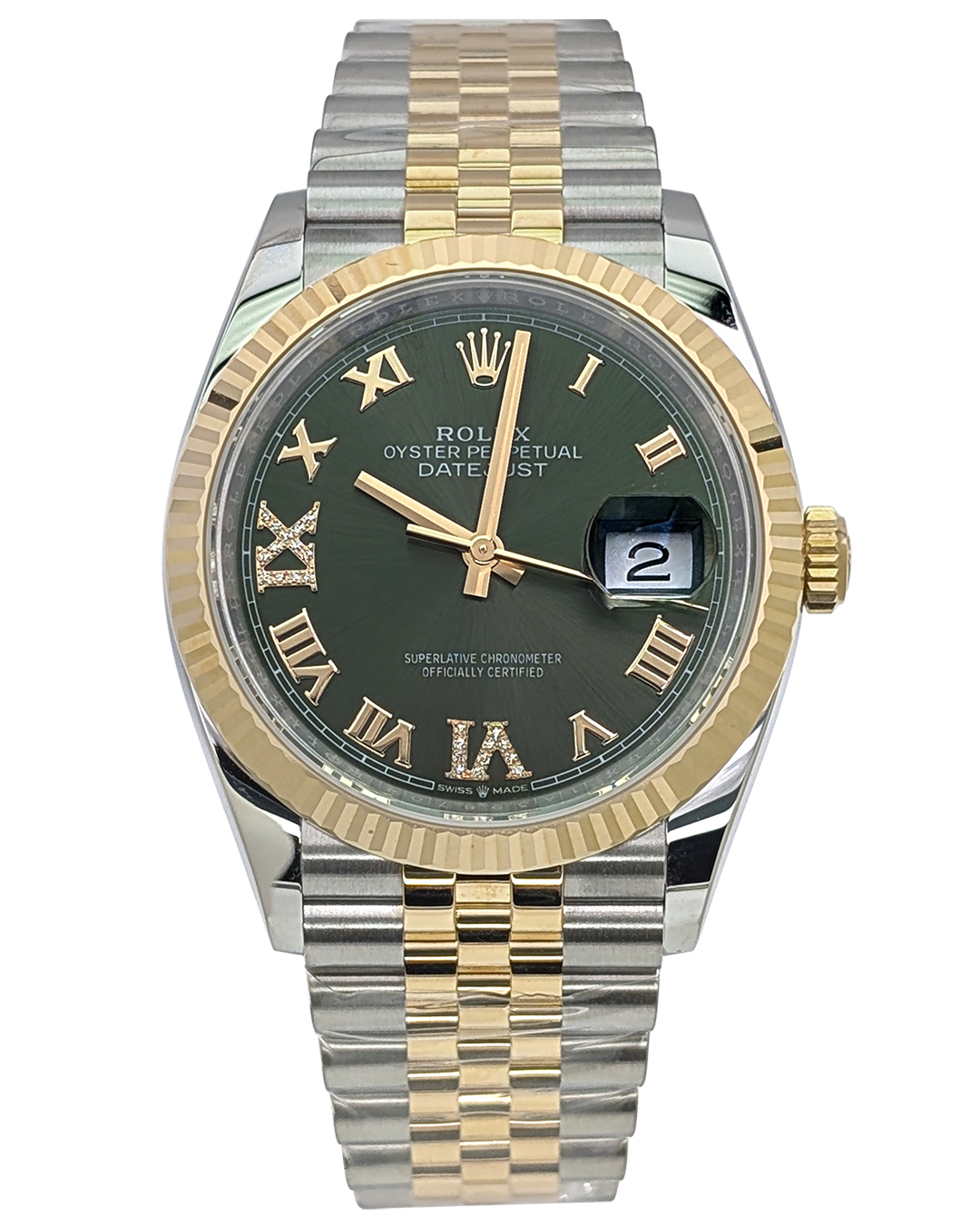 Rolex Datejust 36mm SS/YG Fluted Bezel Olive Green ROM 24DI/6.9 Y Dial Jubilee Bracelet Auto Men Watch