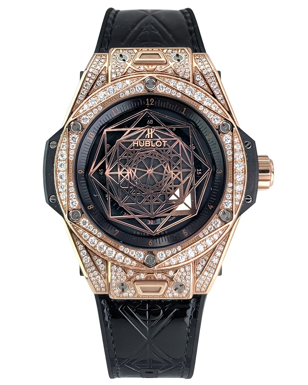 Hublot Big Bang Sang Bleu King Gold PAVE 39mm 18K RG Diamonds Case Black Dial Rubber/Leather Strap Auto Men Watch