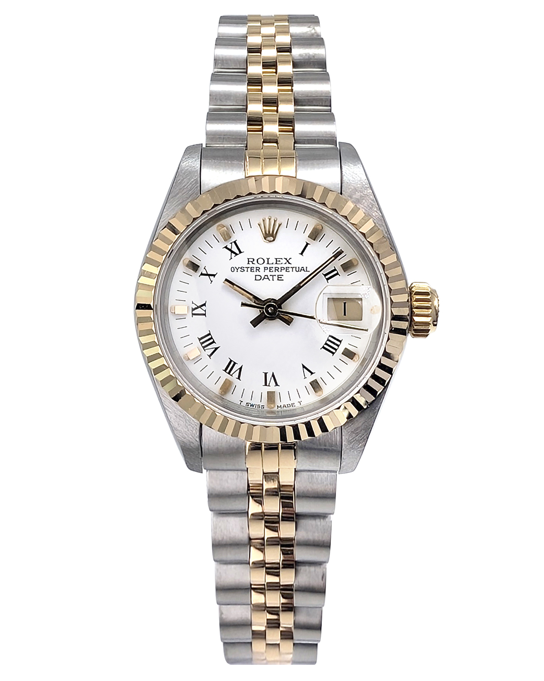 Rolex Oyster Perpetual Date 26mm SS/YG Fluted Bezel White Roman Dial Jubilee Bracelet Auto Lady Watch