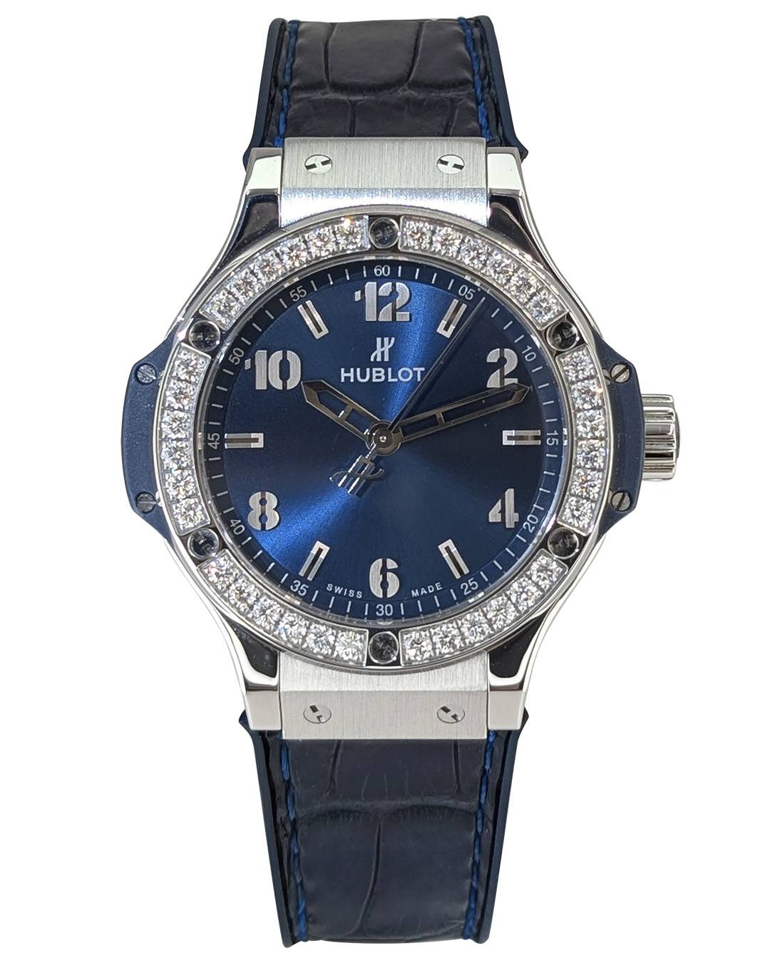 Hublot Big Bang 38mm SS Diamonds Bezel Blue Dial Leather/Rubber Strap Quartz Lady Watch