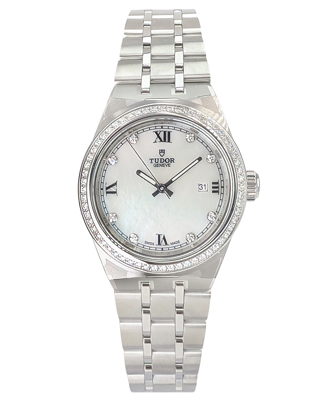 Tudor Royal 28mm SS Diamonds Bezel White MOP 8BR Dial Bracelet Auto Lady Watch