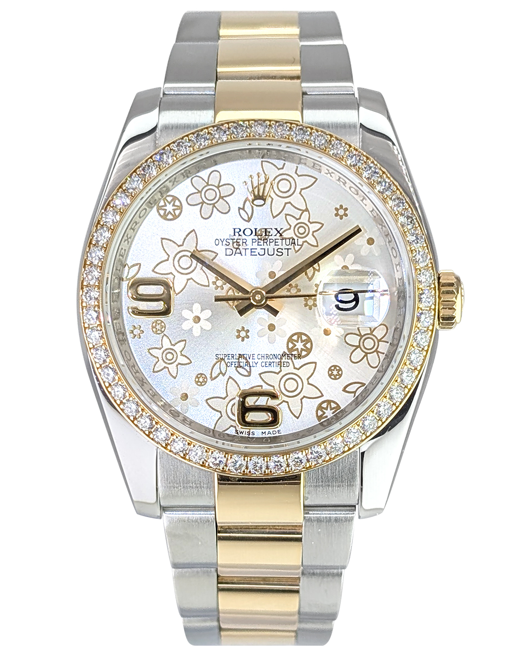 Rolex Datejust 36mm SS/YG Diamonds Bezel Silver Floral Dial Oyster Bracelet Auto Men Watch