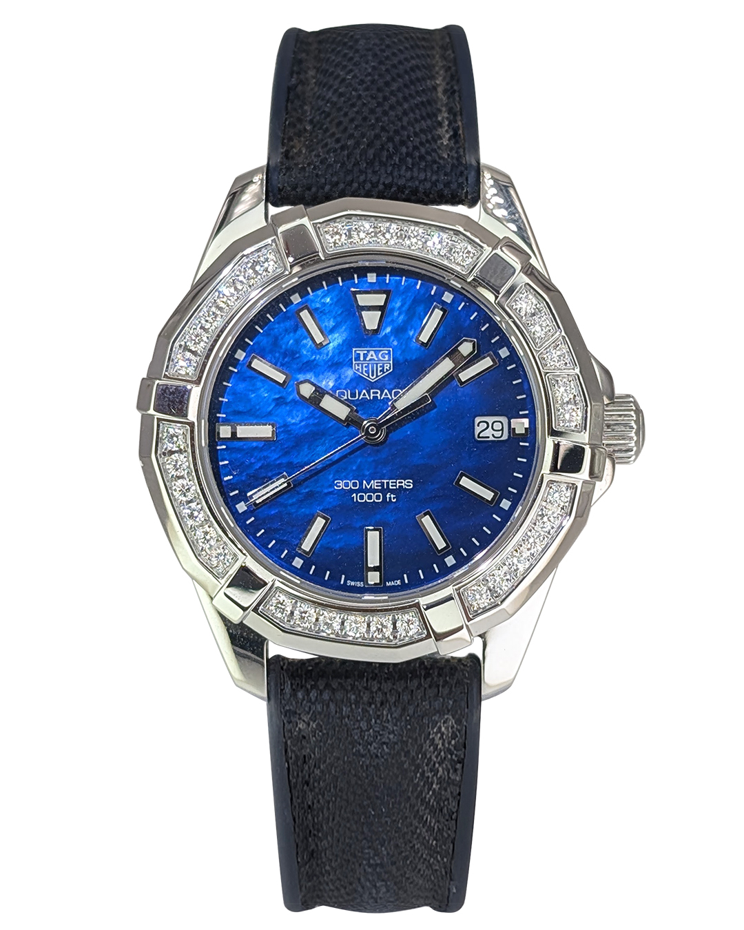 TAG Heuer Aquaracer 35mm SS Diamonds Bezel Blue Index Dial Blue Rubber Strap Quartz Lady Watch