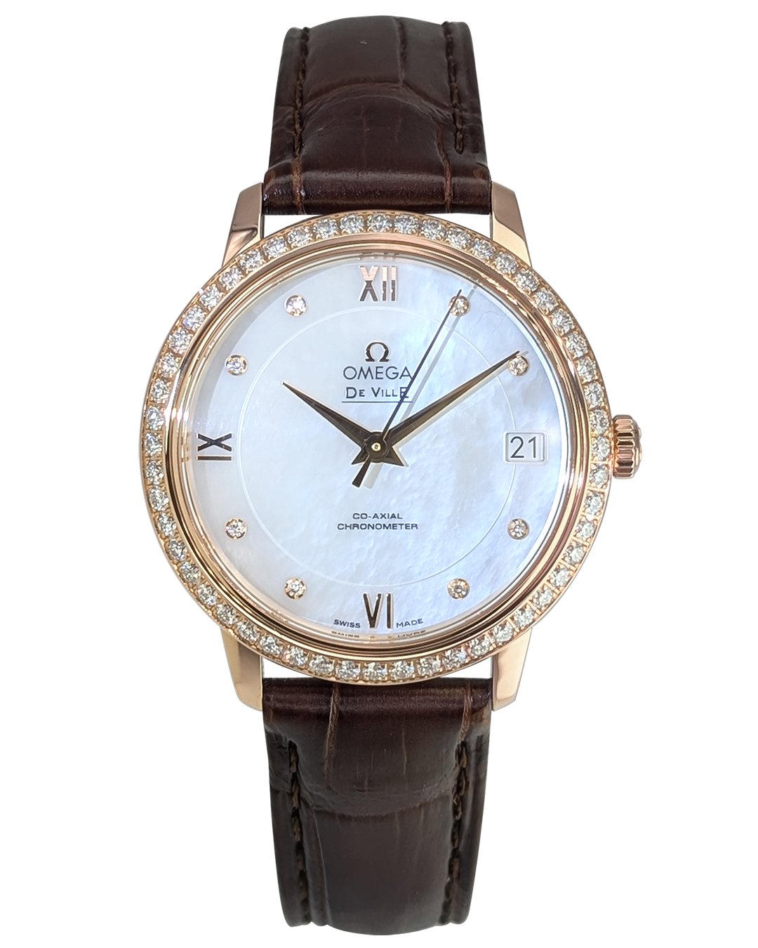 Omega Deville Prestige 33mm 18K RG Diamonds Bezel MOP Dial Leather Strap Auto Lady Watch